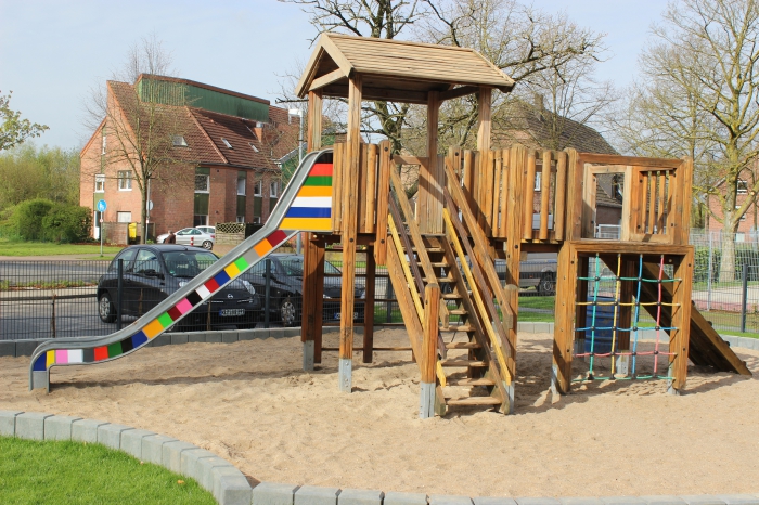 Sandkästen, Matschanlage und ein Klettertunnel gehören auch dazu.